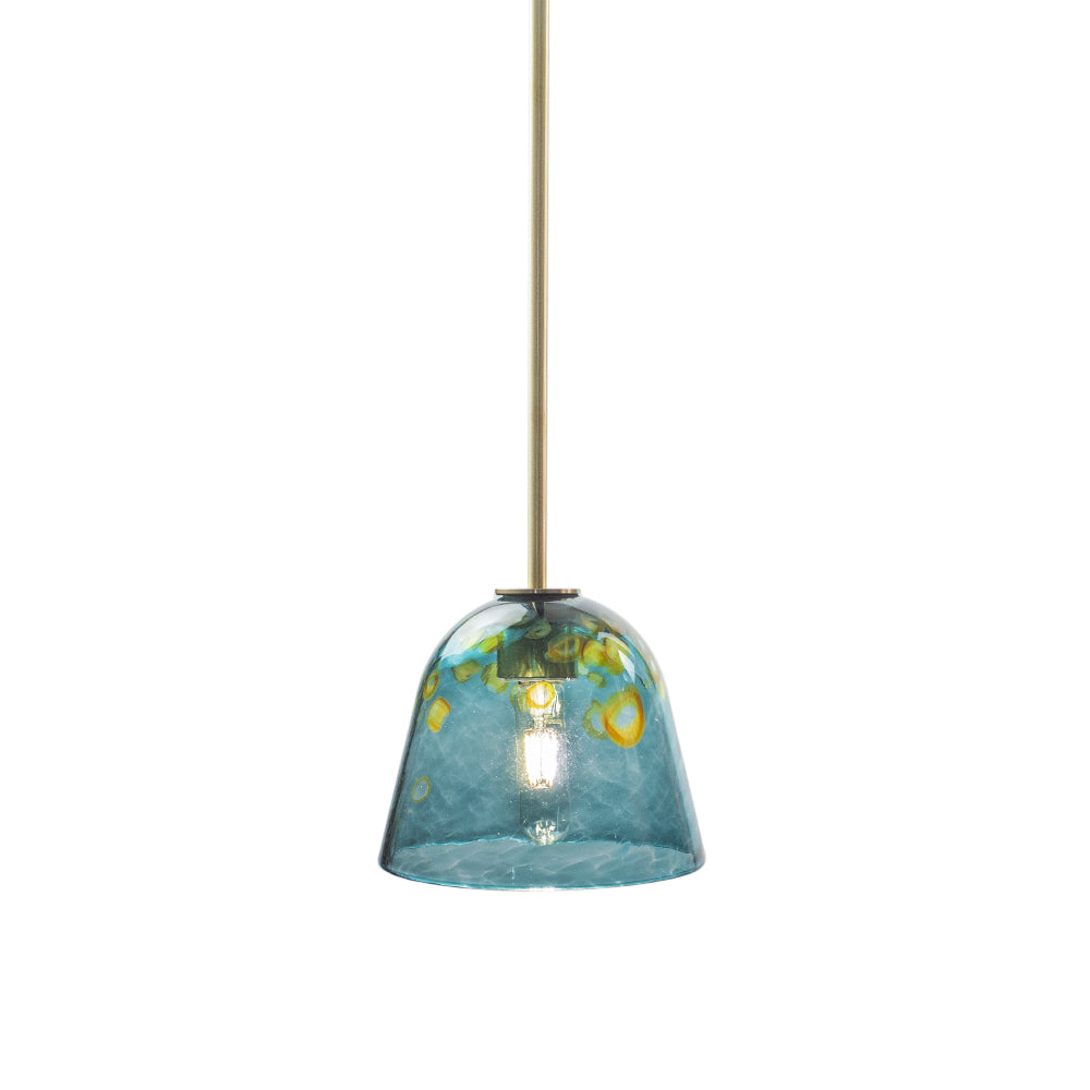 This lighting fixture is a Wimberley Glassworks' American made in-house design with signature hand-blown glass shades. It is available in an array of durable natural finishes or powder coat colors, and colored glass patterns crafted by our skilled team of artisans. Both components are proudly made in Texas.
