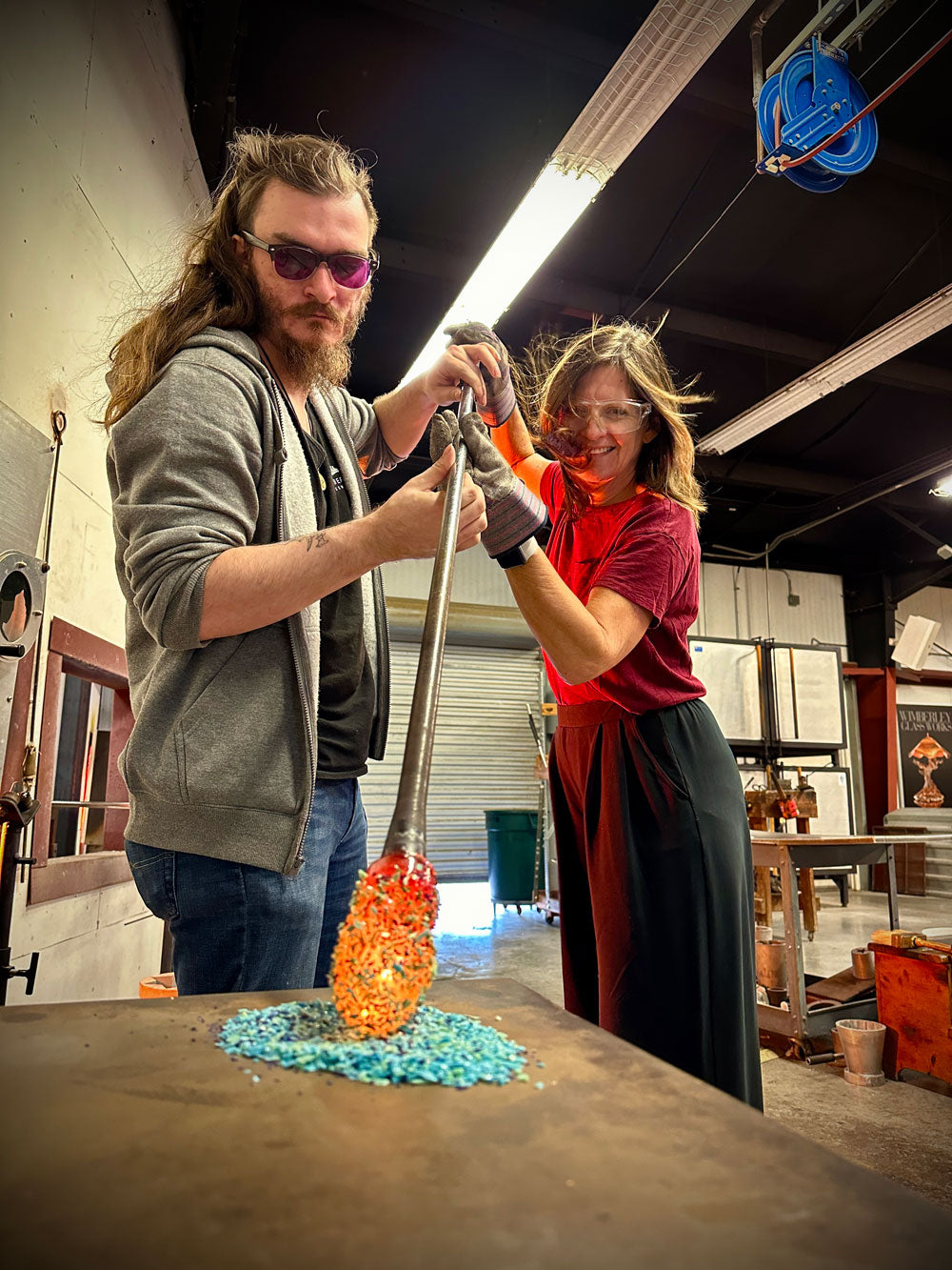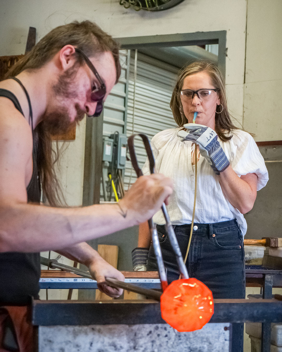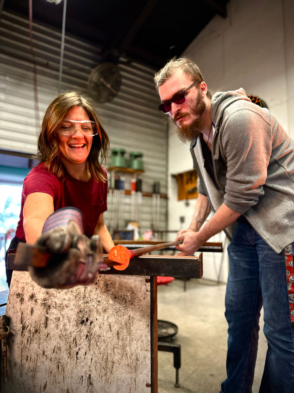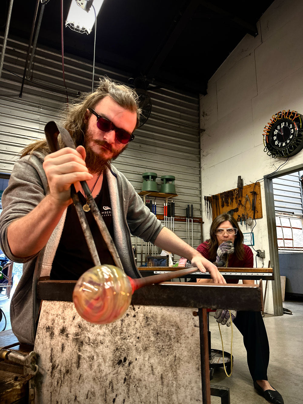 For this experience, you will choose your colors, roll the hot glass in the color, blow into the piece, sit on our glassblowing bench using a hand-held wood mold to shape, then manipulate the glass using the jacks tool. We'll finish the piece into an ornament with lots of character.