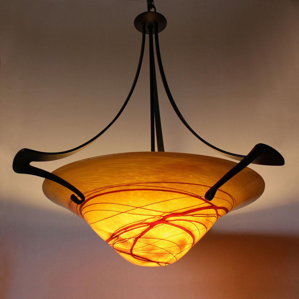 This lighting fixture is a combination of hand-forged steel by Hubbardton Forge and Wimberley Glassworks’ signature hand-blown glass shades. It is available in an array of durable powder coat finishes and colored glass patterns crafted by our skilled team of artisans. Both components are proudly made in the USA.