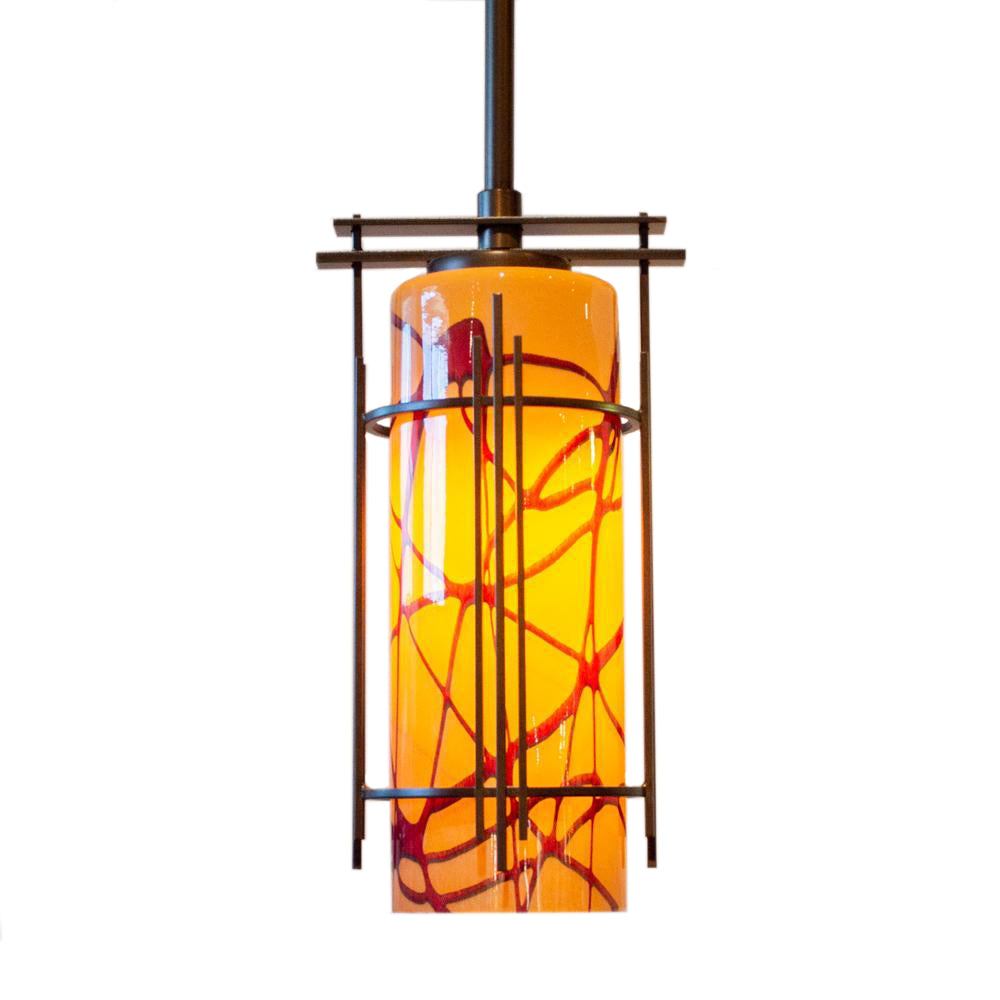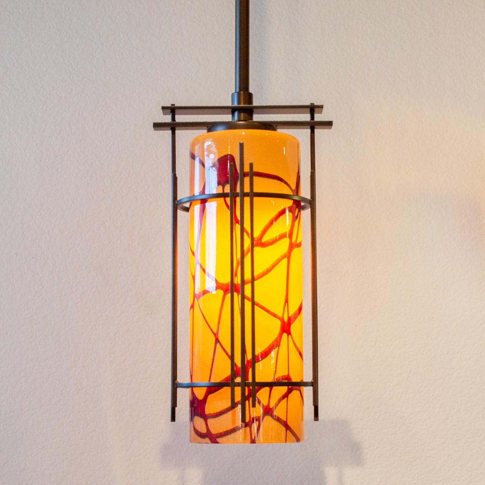 This lighting fixture is a combination of hand-forged steel by Hubbardton Forge and Wimberley Glassworks’ signature hand-blown glass shades. It is available in an array of durable powder coat finishes and colored glass patterns crafted by our skilled team of artisans. Both components are proudly made in the USA.