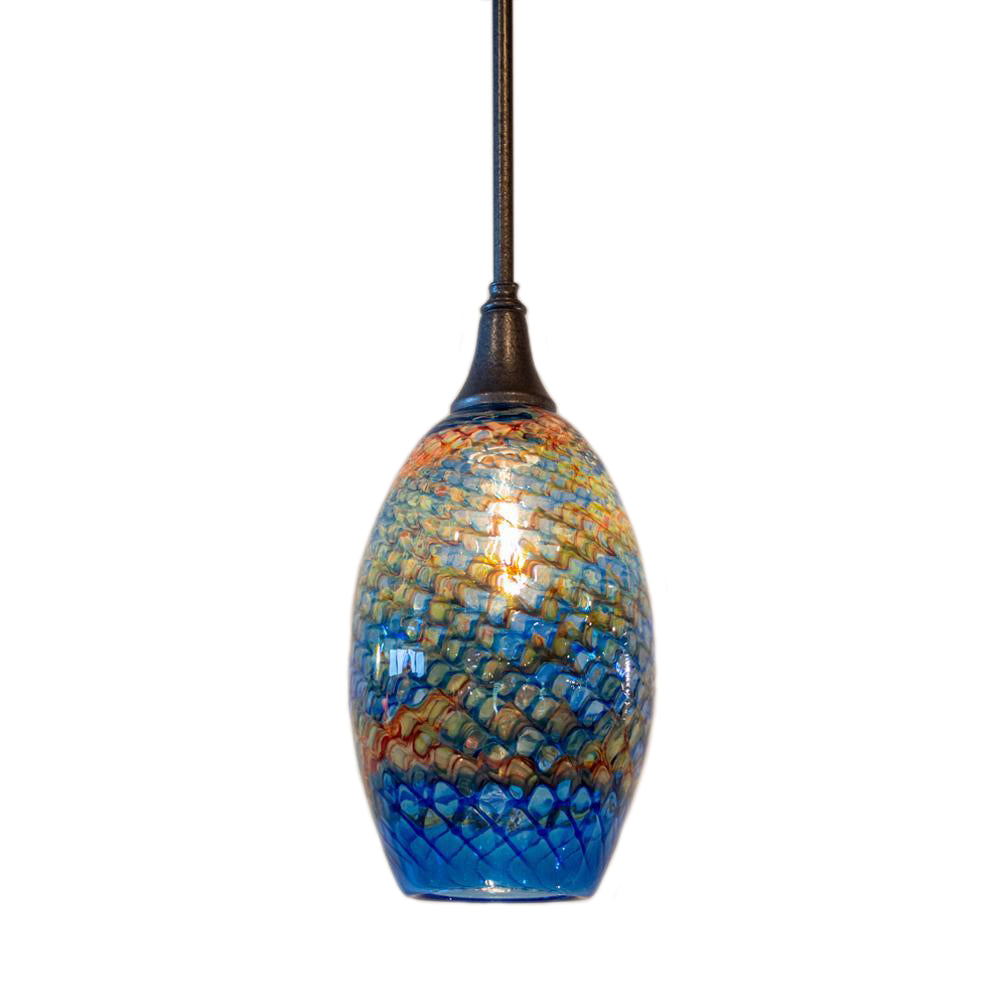 This lighting fixture is a combination of hand-forged steel by Hubbardton Forge and Wimberley Glassworks’ signature hand-blown glass shades. It is available in an array of durable powder coat finishes and colored glass patterns crafted by our skilled team of artisans. Both components are proudly made in the USA.