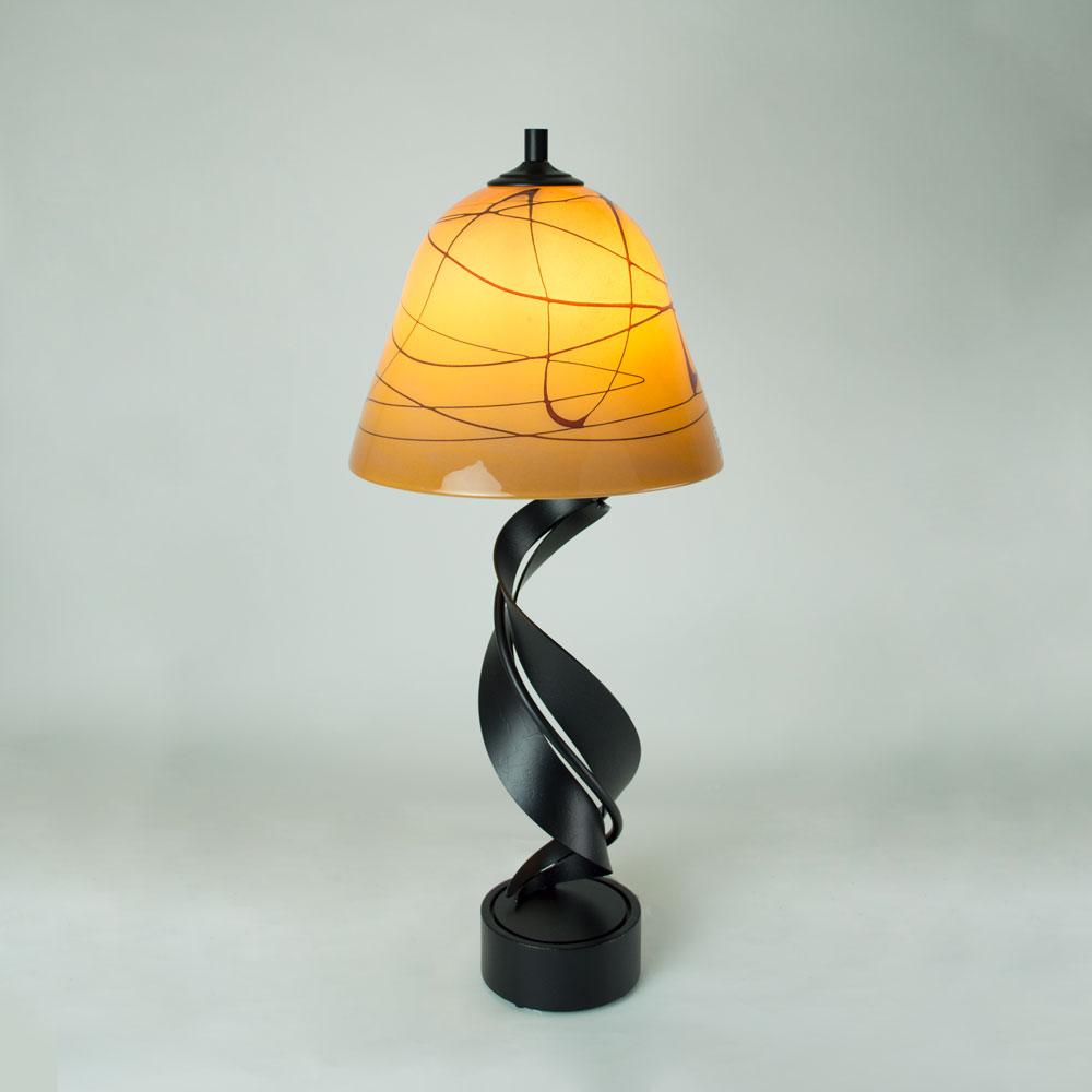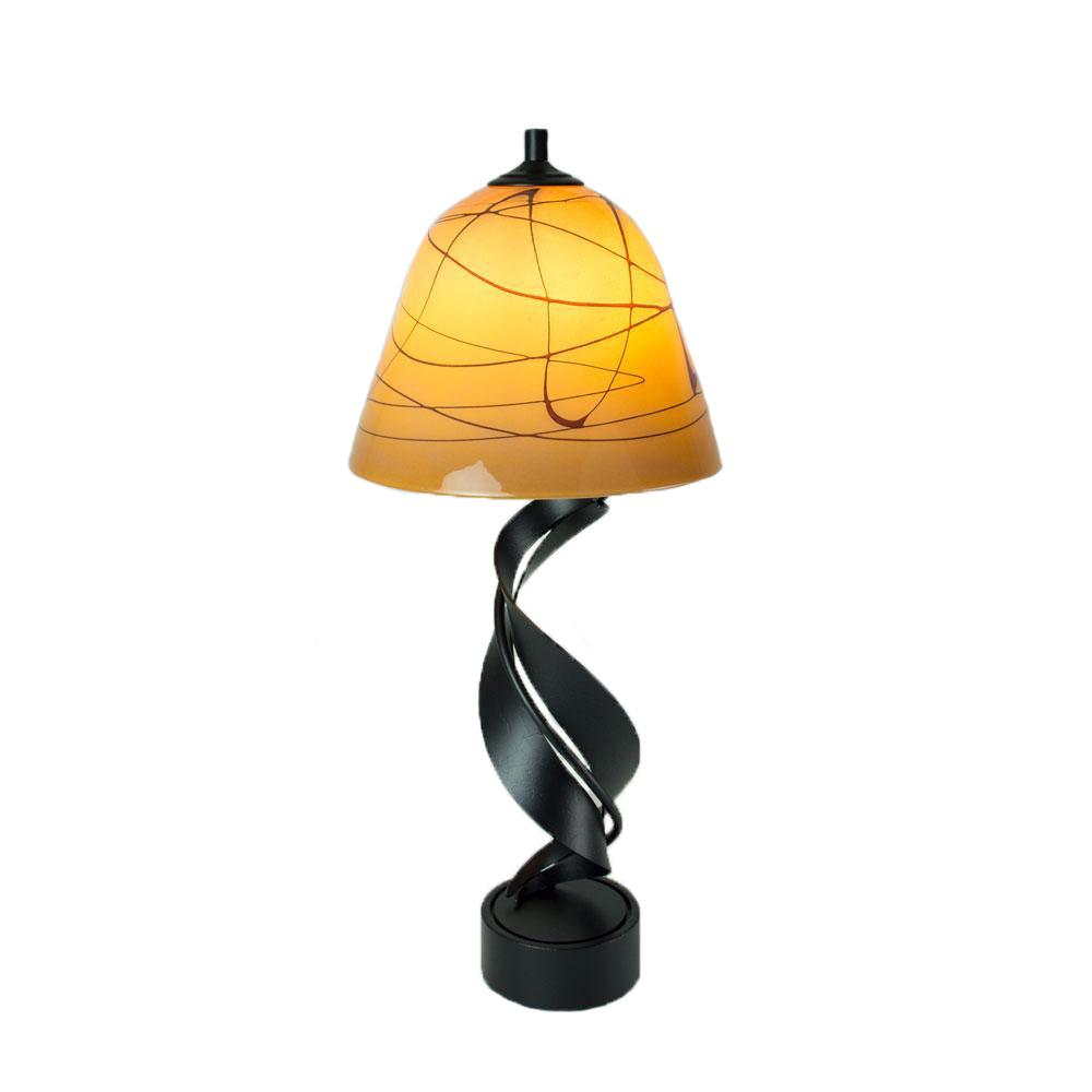 Handcrafted Folio table lamp with blown glass shade in gold and red Random Trail pattern and hand-forged metal base for vibrant home decor.