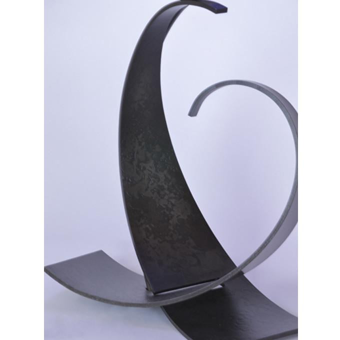 This table lamp features two intersecting arcs of steel top which sits an extra large shade, with shade options, opposed contours and offset base. This statement piece lamp looks great on a console table, side table, or in an office. It is also available in a smaller version.