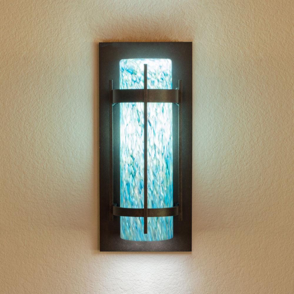 This lighting fixture is a combination of hand-forged steel by Hubbardton Forge and Wimberley Glassworks’ signature hand-blown glass shades. It is available in an array of durable powder coat finishes and colored glass patterns crafted by our skilled team of artisans. Both components are proudly made in the USA.