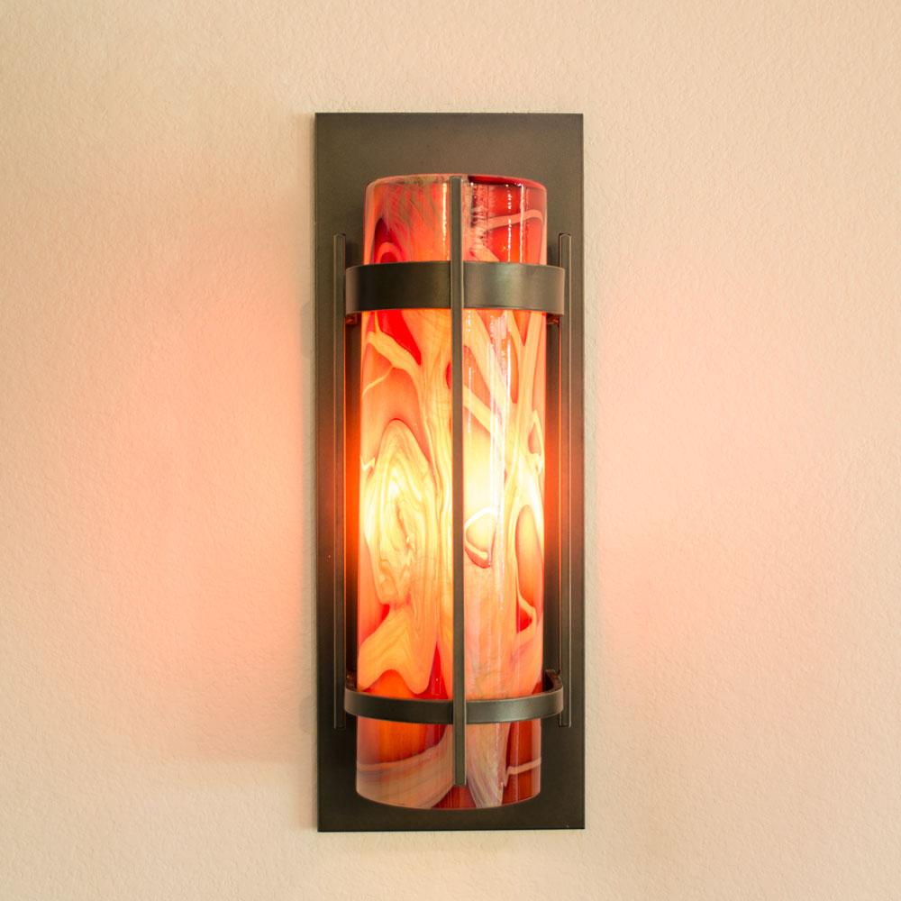 This small indoor rated, direct wire sconce features two bands of steel with one vertical wrapped around a 3" diameter cylinder of glass. This works great surrounding a feature fireplace or tv, or even in a bathroom.
